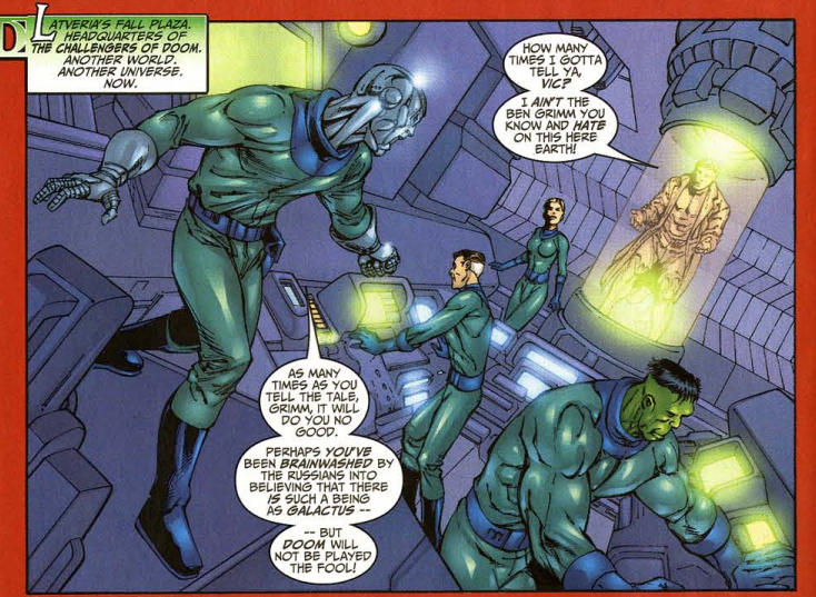 Roma then offers more exposition, saying that there is a Galactus in every universe, and each universe’s Galactus is what kept Abraxas at bay. When the Marvel Universe’s Galactus died in the Galactus the Devourer miniseries, that opened the door for Abraxas to begin his mad killing spree. Further, Roma explains that the alt-universe versions of Johnny on the world Reed, Sue, and Ben are visiting each contain one piece of the Nullifier’s location in their psyche. All this and we’re just on page 3 of the comic.
