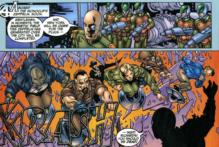 In “Five for the Future,” Reed learns this universe’s Johnny is dead. Sue, who is an investigative reporter here, delivers the bad news. The Five prepare to deal with supervillain the Monocle, who has a zeppelin attached to the Chrysler Building, and is drawing energy from the entire city. Reed puts his worries about Johnny aside and uses his counterpart’s tech to lead an assault on the zeppelin. The heroes stop the Monocle and send the zeppelin flying to the nearest air force base. Later, Sue explains that she saw a light in Johnny’s eyes just before he died. This is enough, as Reed is able to scan Sue’s memories and gain the third clue to the Nullifier.
