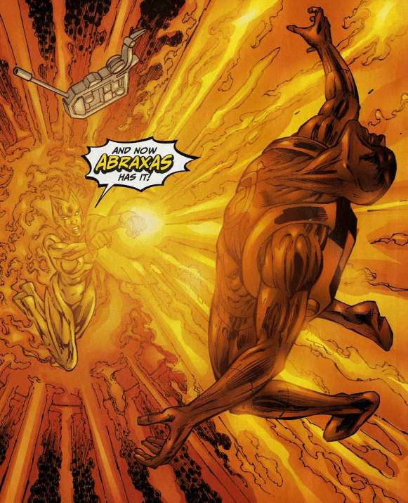 In space, Johnny has been gradually remembering his way to the Nullifier. (this is seemingly the same path he took through the cosmos during the original Galactus trilogy in issues 49-51.) He and Nova travel through a portal into an alien complex where the Nullifier awaits. Just as Johnny grabs hold of it, Nova proclaims “And now Abraxas has it!” She blasts Johnny with flame and takes the Nullifier.
