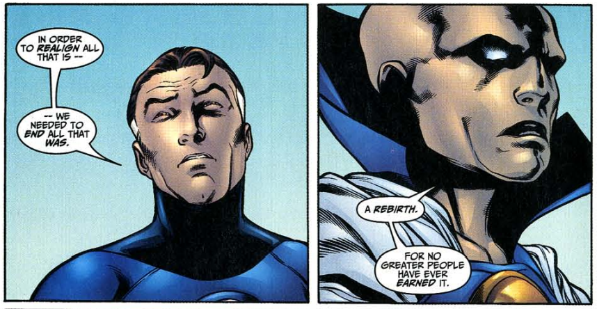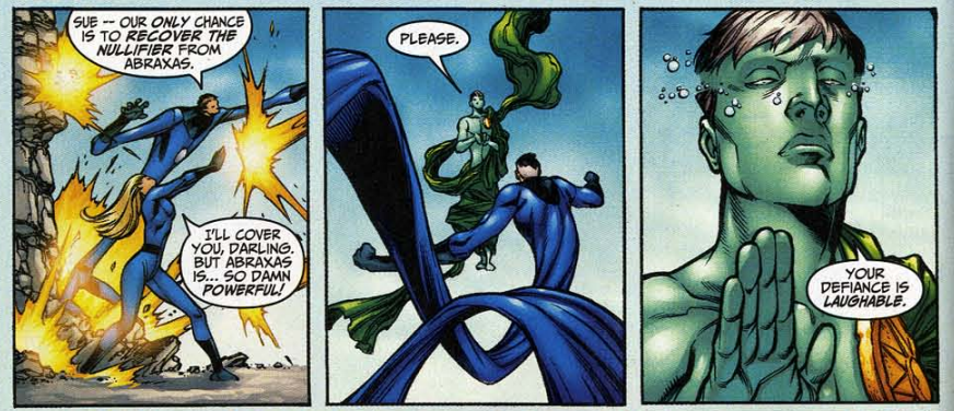 To recap, the godlike villain Abraxas (not the one from the Jesse Ventura movie) is on a killing spree across the multiverse, because he believes the only way to achieve perfection is in pure nothingness. The FF went on a cosmic quest across other universes to obtain the Ultimate Nullifier, which is powerful enough to destroy Abraxas. An alternate universe version of Johnny’s ex Frankie Raye a.k.a. Nova betrayed the FF and gave the Nullifier to Abraxas. This issue begins with him contemplating the Nullifier, saying, “And so it ends.”