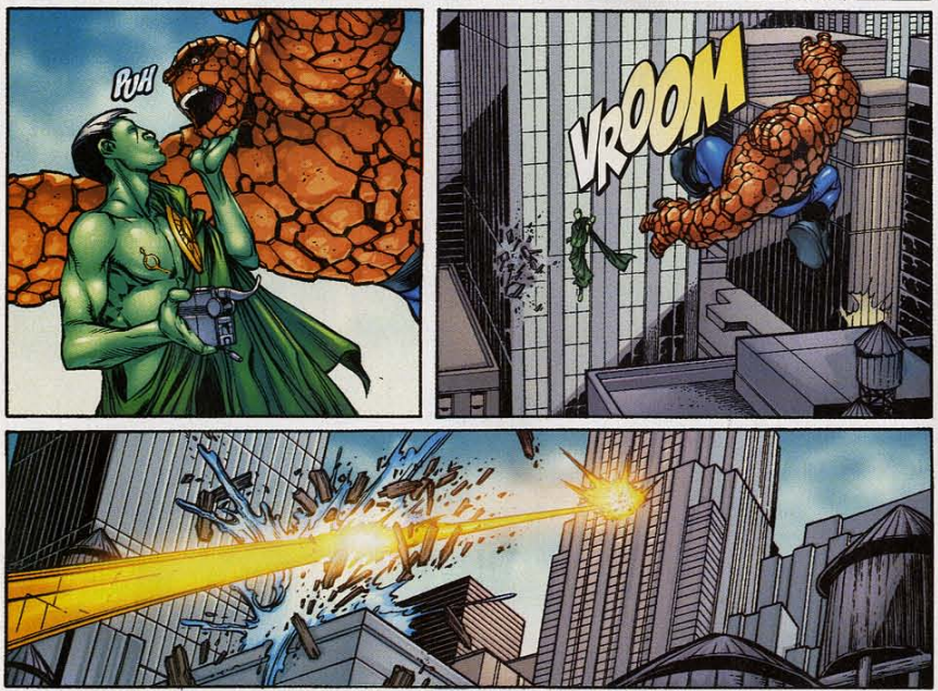 Clobberin’ time: After the universe gets rebooted, Ben reappears on the FF’s roof and just says, “Huh.” I guess he’s been a member of the FF for so long that he has some sense of when a big cosmic event happened.