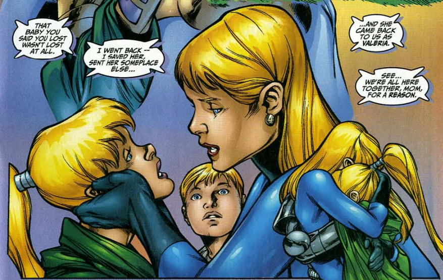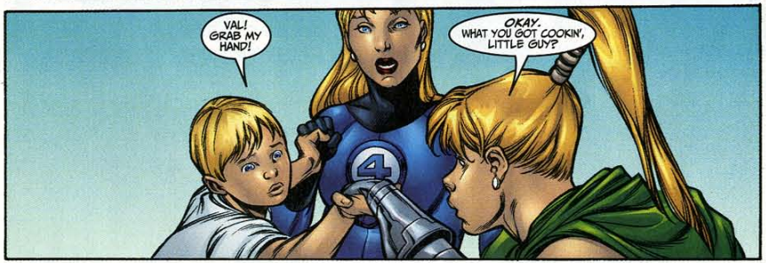 Our gal Val: Let me see if I’ve got this straight. In this issue, Franklin reaches back in time to the birth of Reed and Sue’s second child. He time-displaces the baby into an alternate future where Sue is married to Dr. Doom. The girl is raised as Valeria Von Doom. As a teen, Valeria “time-dances” to the FF’s present to become a member of the family. And this was done so that Valeria could add her power to Franklin’s so Franklin could bring Galactus back to life to defeat Abraxas, after which Valeria was restored in the timeline back to being Reed and Sue’s unborn child. Is that it? I think that’s it.