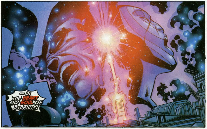 Turn the page and there’s a two-page spread of Eternity in pain as he seemingly breaks apart into pieces… of Eternity? Okay. The next page is half blank, and then we return to the Baxter Building, where (mostly) everything is back to normal. Namorita is alive again, and she and Johnny reunite. The Watcher appears, and he has his memory back (he lost his memory at the start of this story arc). Franklin comments that Abraxas is gone, and so is Valeria. The Silver Surfer flies by, back to life after he was “permanently” killed in vol. 3 #46.