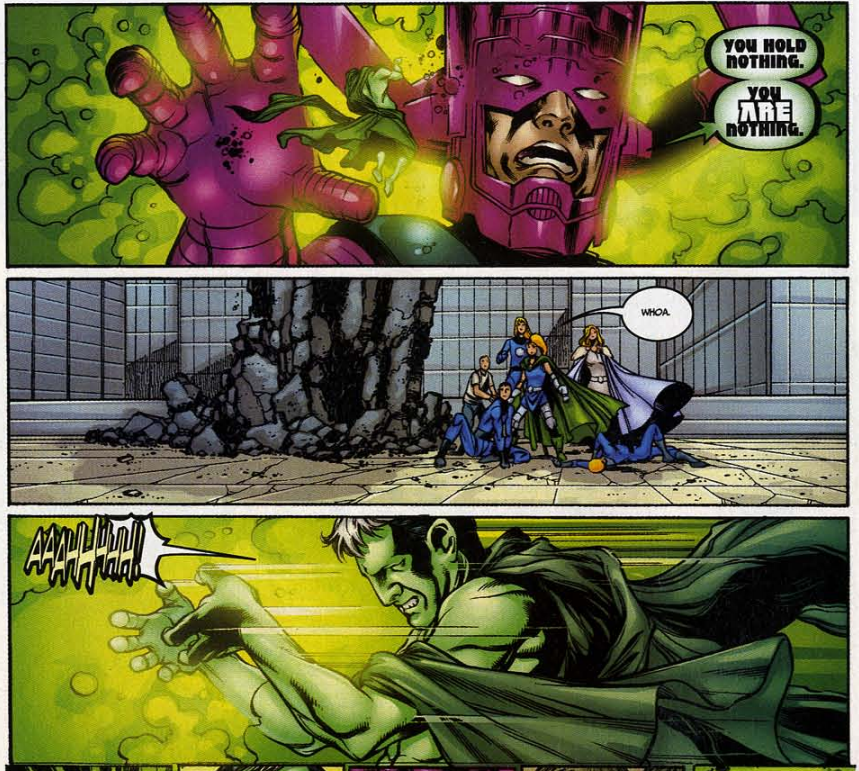 Abraxas still armed with the Ultimate Nullifier, confronts Galactus. Galactus says to Abraxas, “You hold nothing. You are nothing.” The Nullifier disappears, and Galactus says the Nullifier was a part of him all along. The Novas attack Galactus, but he blasts them all into skeletons. (Damn!) Reed conveniently recovers from his injuries, and Galactus hands him the Nullifier, saying, “This day can end only one way.” Reed says Abraxas never intended to fire the Nullifier, “for the very same reason I must!”