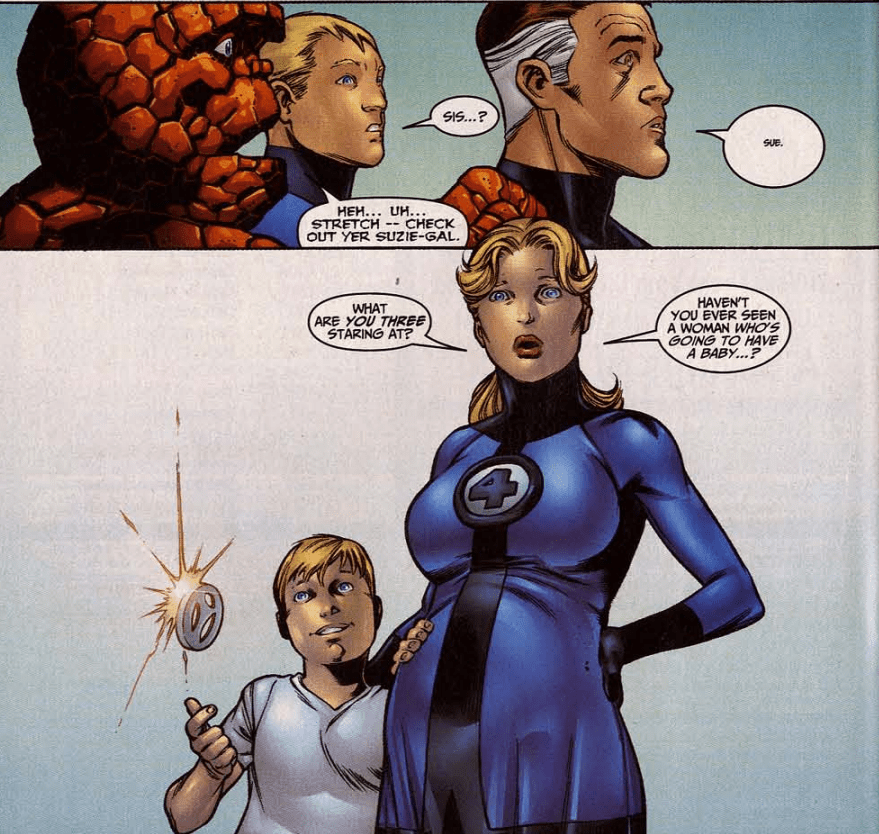 Fade out: In the flashback to Sue’s pregnancy the doctors on the scene are Bruce Banner, a.k.a. the Hulk, and Michael Morbius, a.k.a. Morbius the Living Vampire. Look closely on the next page, and you can see the third doctor is Ben’s Uncle Jake.