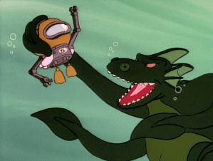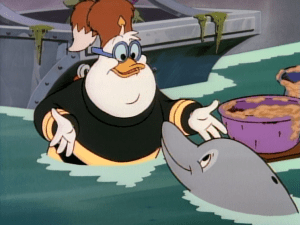 Turns out the city dump is the lost city of Atlantis, where the four ducks are put to work as trashmen. They plan a jailbreak, but are stopped by the fish folks’ monster, Globzilla. Gyro comes up with an idea to create a fizzy drink in large enough quantity to float all of Atlantis to the surface, taking the money with it. Doofus, who has befriended local dolphins, recuits them to help. Launchpad and the dolphins lead the fish folk and Globzilla on a wild chase through Atlantis. The plan works, the fish folk end up Thanking Scrooge for taking away all their garbage.