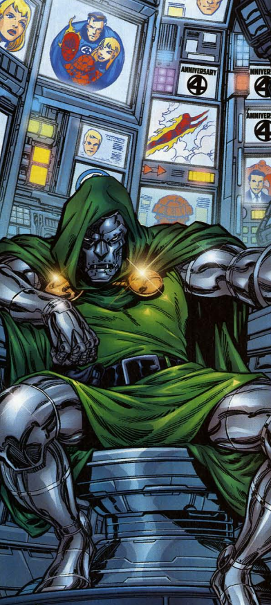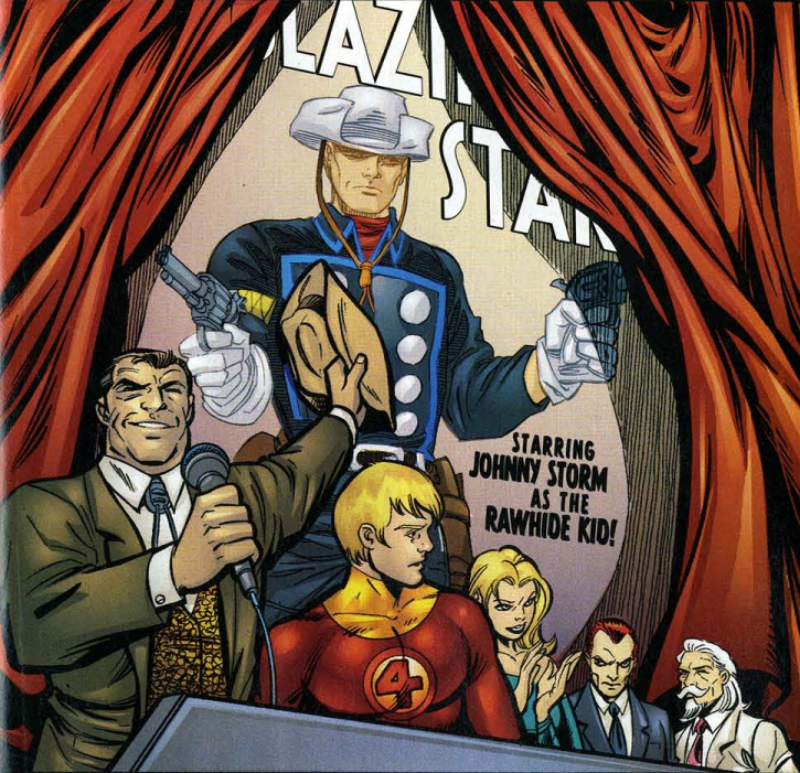 Back in the present, Johnny’s party goes well, and we see that his movie is a Western called Blazing Star, and Johnny is playing the Rawhide Kid. Ben helps one of the chess guys win his game, and Sue uses her powers to let everyone see the baby, who is healthy. Sue, Ben, and Johnny confront Reed in his lab holding up a newspaper with their picture and the headline “Anniversary.” From that, we can interpret this is how they spent their anniversary of the day they got their powers. On the last page, Dr. Doom is all along, watching footage of the FF’s anniversary coverage. He taps his finger on the arm of his chair, making the “tac-tac-tac” noise.