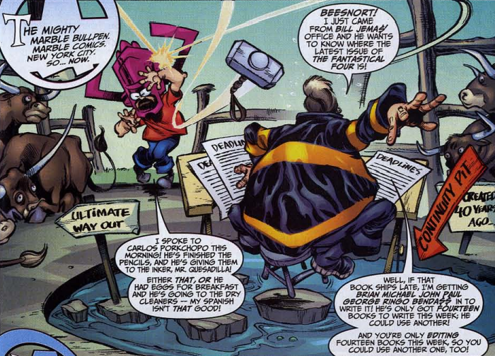The second story is a parody in the style of Marvel’s famously unfunny comedy series Not Brand Ecch. Various Marvel staffers play FF characters and their villains in an overly wacky look at how the comic is made.