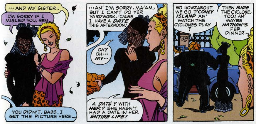 The third story, “Eye of the Beholder,” Ben and Johnny are participating in a bachelor auction alongside Tony Stark. It’s hosted by Rosie O’Donnell, of all people. A beautiful woman bids on Johnny right away. Ben suspects no one will bid on him, but Sue, She-Hulk, and the Wasp are all in the audience, and they all bid on him. A mystery woman in a veil wins the bid with ten thousand dollars. Ben learns the veiled woman, Babs, keeps her face hidden because she suffers from psoriasis, and she was only bidding on behalf of her sister, not herself. Upon meeting the sister, Ben says he would rather go out with Babs. Johnny, meanwhile, learns that his date also bid on behalf of someone else, a woman badly burned in a fire, and she wants Johnny to help her get over her fear of flame. The next morning, Sue asks Ben and Johnny how their dates went, and they answer in unison, “I met the beautiful girl today!”