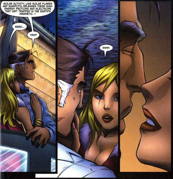 The fourth and final story has Ben and Johnny out shopping, looking for an anniversary gift for Reed and Sue. They get chased by groupies for a bit, and then sit on a bench while struggling to think of the perfect gift idea. They then spot a travel agency, and arrange an Alaskan cruise for the whole family. On the cruise, Reed pontificates about the science of the northern lights, but Sue shushes him with a kiss.