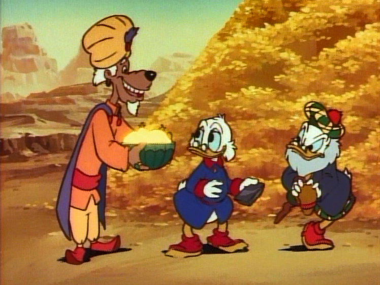 Here’s what happens: Scrooge and Glomgold are competing over the rights to sell the amazing glowing fruit of Macaroon, which could potentially replace the lightbulb. To do this, Macroon’s leader, the Grand Kishke, had decided that the two must physically weigh their fortunes on giant scales to determine who is most rich and successful duck. (I question whether this is how the economy actually works.) Glomgold is in Macroon, ready to go, while Scrooge is still retrieving his lost gold from the ocean floor. Glomgold has the Beagle Boys transported to Macaroon to help him prevent Scrooge from delivering.