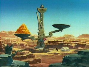 Thoughts upon this viewing: Nothing in this episode makes any sense, from the idea of weighing all the money, to the logistics of a floating city, to why the glowing fruit was never seen again after this. But there’s a real sense of adventure to it all, and there’s a great concept in having an ancient city in the clouds that’s all yours to run around in.