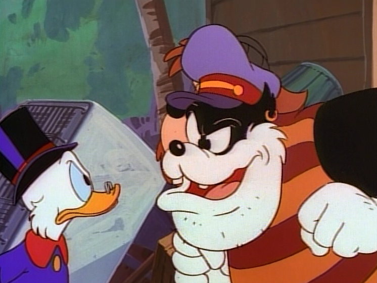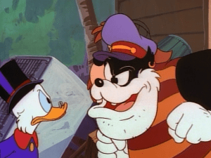 Here’s what happens: One of ships in Scrooge’s fleet is destroyed by a sea monster. While Scrooge meets with the Coast Guard about the incident, his nephews, Webby, and Doofus are visiting the nearby docks to get a sailing merit badge, with Launchpad as their Woodchuck leader. Scrooge then spots a truck carrying some of his lost cargo. It’s been salvaged by Dogface Pete (played by go-to Disney villain Pete), and he got it all legally from the bottom of the ocean under salvage laws.