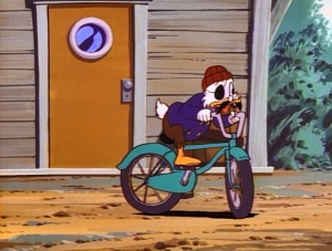 Humbug: When disguised as one of Pete’s crew, Scrooge tries and fails to ride a bicycle. He says that of all the skills he’s learned over the years, riding a bicycle isn’t one of them.