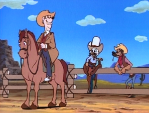 J.R. cheats in the cowboy contest, claiming Scrooge’s wealth for himself. Huey, Dewey and Louie befriend the white buffalo and ride it back to the dude ranch. Scrooge and the boys return to the ghost town in search of the oil. They confront the “ghost,” and discover a secret underground pump draining Scrooge’s oil field dry. It’s a real Scooby Doo ending when Tex is revealed to be the ghost in disguise. J.R. admits to his cheating and lets Scrooge keep his fortune, and everyone gathers around a campfire for the happy ending.