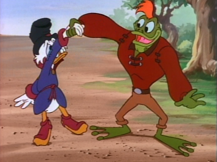 Foul fowls: The Beagle Boys in this one are Big Time, Burger, and Bugle. The episode mistakenly refers to Bugle as Bebop Beagle. We can explain this way by having it all be a dream.