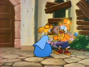 Here’s what happens: Scrooge has the flu, and his family insists that he spend the day in bed. This just makes him more miserable. Webby tries cheering him up by reading him the story of Cinderella. Scrooge falls asleep and dreams he is “Scroogerello,” with Glomgold as his wicked stepfather and the Beagle Boys as his wicked stepbrothers. The villains plot to swindle a fortune from Princess Goldie at the royal ball, and Scrooge hopes to stop them.