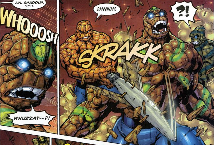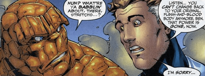 On Earth, Reed activates his device, and Ben and the other Things are teleported to the Baxter Building. Reed, Sue and Johnny join the fight, until the hyper-intelligent Thing skin from the future destroys the other Things. Reed explains that it can control its own molecular form, which includes its ancestral forms as well. The future-Thing-skin disappears, and Reed explains that every time Ben turned human, his rocky shell reverted a virtual state, which acted as a catalyst for his skin’s replicative and mutative processes. The only way to stop this from happening was to remove Ben’s ability to turn human. Upon hearing this, Ben simply says “What?” and the issue ends.