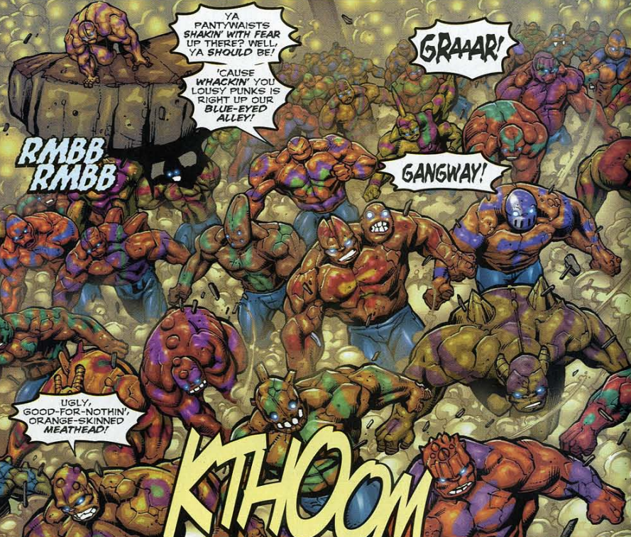 Clobberin’ time: Can we figure out how this happened? Ben gained the power to transform into a human after a fight with the Grey Gargoyle, because people turned to stone by G.G. eventually turn human again. But Grey Gargoyle got his powers from a chemistry accident, so where’d all this temporal “skin-spawn” stuff come from. I think the answer comes from a few panels where the future-Thing-skin-thing blasts the monster Things with what looks like the cosmic rays that gave the FF their powers back in issue #1. I think we can assume the skin-spawn originated more from the cosmic rays rather than from the Grey Gargoyle.