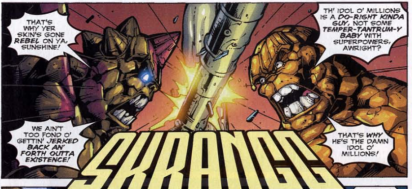 Reed’s device reveals a hyper-intelligent evolution of Ben’s skin from thousands of years in the future. He hopes to communicate with it. In the pocket universe, Ben leads the other good Things in battle with a combined cheer of “It’s clobberin’ time!” The battle goes well at first, but then the monster Things kill all the good ones, until Ben is the only one left standing. As he fights the other Things, Ben argues that he is not a Hulk-like monster destroying everything in sight. Instead, that’s what his enemies do. The monster Things’ leader says that every time Ben transforms into a human, he and the others cease to exist, which is a nightmare to them.