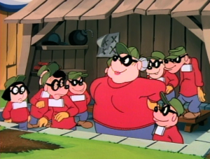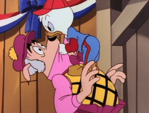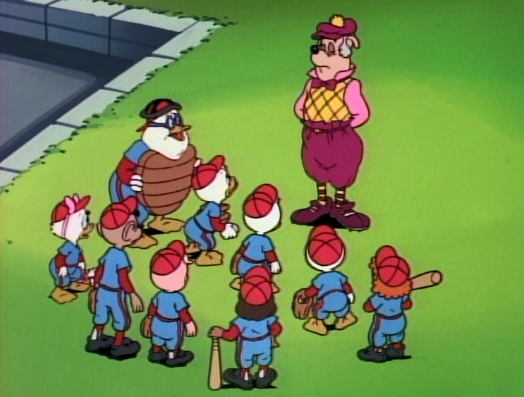 Then, in “Take Me Out of the Ballgame,” Huey, Dewey, Louie, Webby, and Doofus are playing in a Junior Woodchucks baseball game. Scrooge is going out of town, so he leaves his butler Duckworth in charge of coaching the kids’ team. Their opponents are the Beagle Brats, with Ma Beagle as their coach. Duckworth’s old-fashioned style of coaching doesn’t mesh well the rough n’ tumble kids way of playing, and the Woodchucks lose their lead. Then the Beagles start cheating, making matters worse. When Doofus breaks his glasses, he manages a home run thanks to Duckworth’s newfound understanding of having the game be fun, rather than prim and proper. The boys win the game, and the home run ball flies so far out of the ballpark that it hits Launchpad in the head as he and Scrooge fly back to town.
