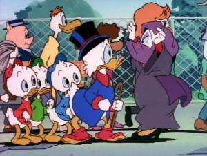 Here’s what happens: In “Magica’s Magic Mirror,” Scrooge and the boys are at the ballgame when a mysterious woman leaves a magic mirror in Scrooge’s hands for safekeeping, saying she’s in danger and pursued by a mystery man. This is all a trick by Magica Dispell, however, in her latest plot to steal Scrooge’s lucky dime. She has an identical mirror, through which she can trick Scrooge and the boys into thinking the mirror can see the future. Through convoluted circumstances, she convinces Scrooge that the only way to save his diamond mines to give his lucky dime to the mystery woman (a.k.a. Magica) from earlier. The nephews figure out what she’s up to by peering into the mirror just a little too long. They then use the mirror to show Scrooge the truth. In an attempt to zap Scrooge, she accidentally zaps herself and teleports herself far away.