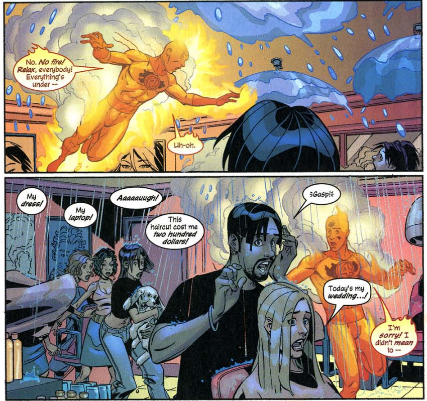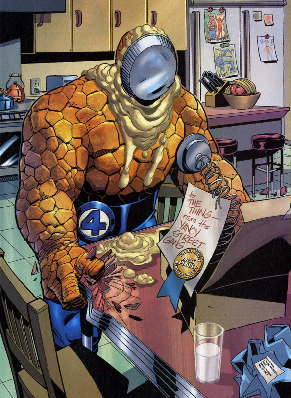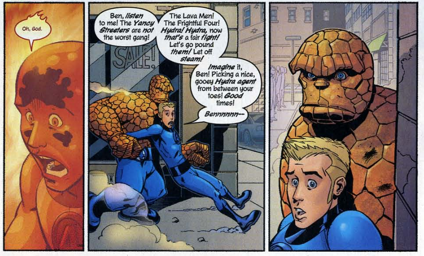 Fantastic or frightful? This is so-called “decompressed” storytelling, where the entire issue is just the opening scene of what’s going to be a longer story. In the old days, this would’ve been the first three pages of the story. This isn’t good or bad, just a different way of looking at things. Maybe it’s a little too convenient for Ben to be this angry just for story purposes, but it means we get to have a fun Johnny/Ben fight, so it’s all good.