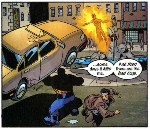 Johnny catches up with Ben once more, and argues that Ben gets made fun of all the time and must be used to it now. Ben says you get used to some days, and some days it kills him. “And then there are the bad days,” he says. He punctuates this point by throwing an NYC taxicab at Johnny. Johnny tries to tell Ben that whoever sent the package never thought of it that way, but Ben doesn’t listen. He continues on.