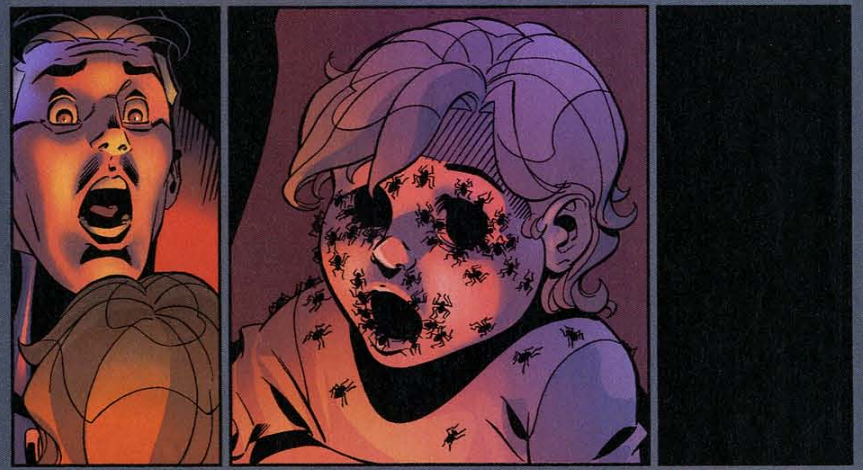 In Reed’s lab, he’s working some high-tech device, when all the power goes out. This confounds him, as the Baxter Building has numerous backups to prevent power outage. Reed finds Franklin in Valeria’s room, where the walls are breaking apart to reveal nightmarish mouths and eyes on the other side. When Reed goes to rescue Valeria, spiders crawl out of her eyes and mouth. Everything goes black, and then returns to normal. Franklin asks Reed what just happened, and Reed admits he doesn’t know. “I don’t like it when you say that,” Franklin says. “Nor I, champ,” Reed says.