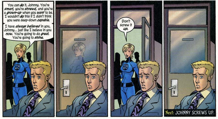 Sue then leaves Johnny alone in his new office, saying “Don’t screw it up.” Then the next issues blurb does an Arrested Development narrator gag with “Next: Johnny screws up.”