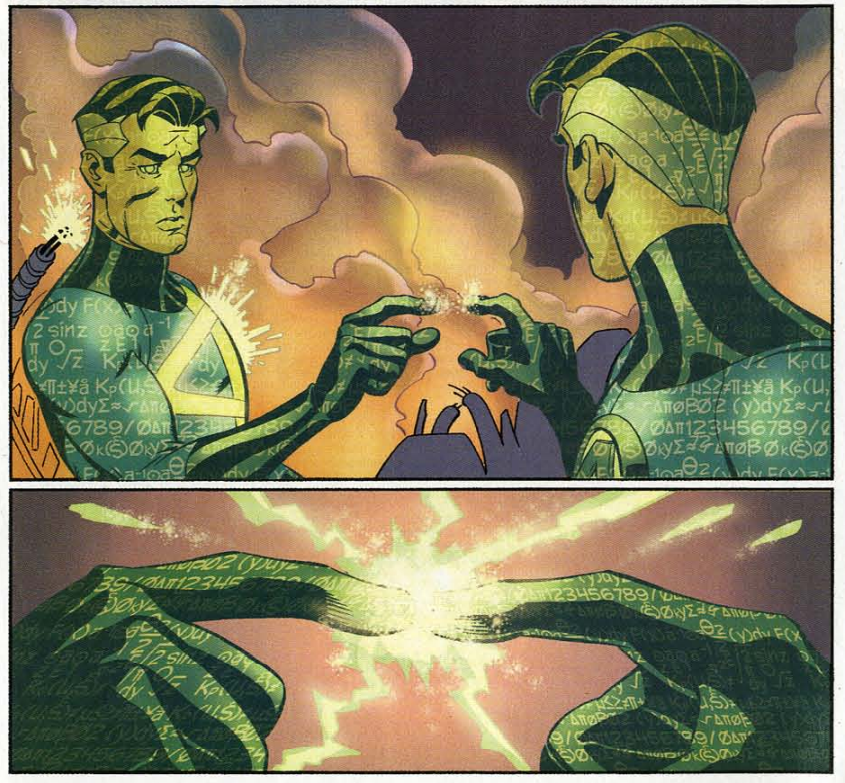 Reed invented a new type of PDA with unlimited computing power, thanks to it being tied to an alternate universe. This inadvertently created Modulus, an electrochemical being that is Reed’s mathematics come to life. To stop Modulus, Reed has entered that alternate dimension to find the equation to… himself. As this issue begins, Johnny and Ben stay behind to fight Modulus. Ben appears to retreat, but it’s all strategy to create more distance between Modulus and Reed.