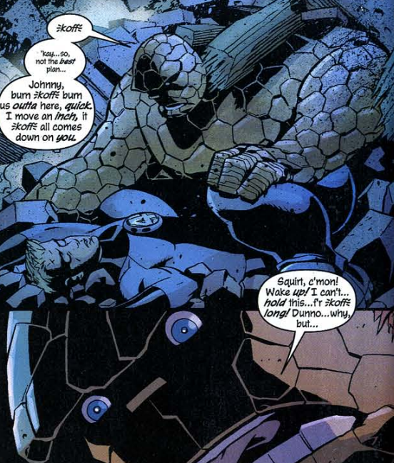 In the other universe, Reed is at work creating a mathematically perfect copy of himself. Sue wants to take Franklin and Valeria away from the Baxter Building for safety, but Modulus has trapped them in there. He has hacked the FF’s communicators to control all their tech. Out in the street, Ben and Johnny lead Modulus into an abandoned building, which Johnny calls “the one piece of Manhattan real estate without a Starbucks.” Modulus uses his ability to separate objects into their basic components, and brings the entire structure down on them. Johnny is knocked unconscious, and it takes all of Ben’s strength to keep the rubble from crushing them both.