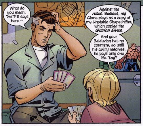 Later, Reed’s lab will have to be rebuilt, but Sue’s injured hand is still able to be returned to normal. Reed and Franklin have gone off alone, with Johnny worrying that Reed is punishing Franklin for messing the PDA. Instead, we see Franklin teaching Reed how to a play a Magic: The Gathering-style card game. The logical Reed is baffled by the game’s fantasy-themed rules, but as Franklin explains it to him, Reed says, “You’re a good teacher.”