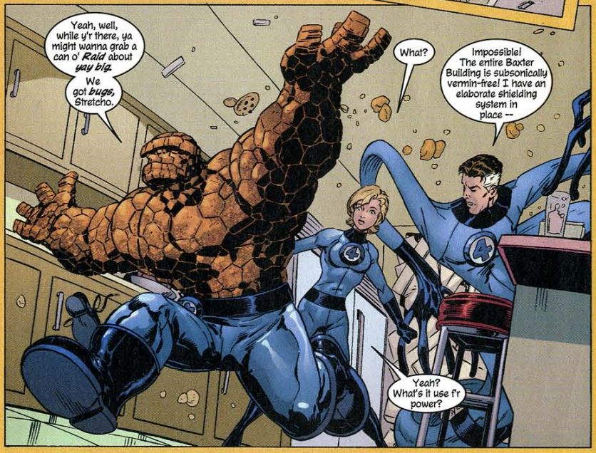 Then there’s more comedy with Johnny and his assistant Jian stuck in traffic while on their way to meet Suarti. He uses a FF universal parking badge to park illegally and then flies himself and Jian to the meeting. Later, Sue learns that Johnny licensed the unstable molecules, and she is upset. Christi lies and says she and Ethan tried to stop Johnny, but Johnny wouldn’t have it. This scene also states that Reed went ahead and gave Johnny the unstable molecules for the deal. This isn’t really followed up on, because Reed is hard at work tracking the alien insect. Reed says the insect can’t be detected by sensors, so he sends Ben into the building’s ventilation system to hunt for it. To get into the ventilation, Reed uses a shrink ray to shrink Ben down to what looks like child-size.