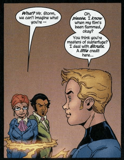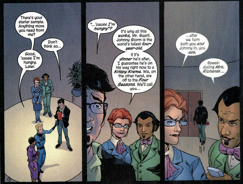 Fantastic or frightful? This is pretty simplistic for a corporate espionage story, but I do like that Johnny isn’t dimwitted, but instead comes out on top. Writer Mark Waid wanted his Fantastic Four stories to be character-focused, and that’s what we get here.