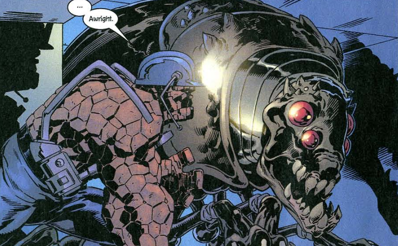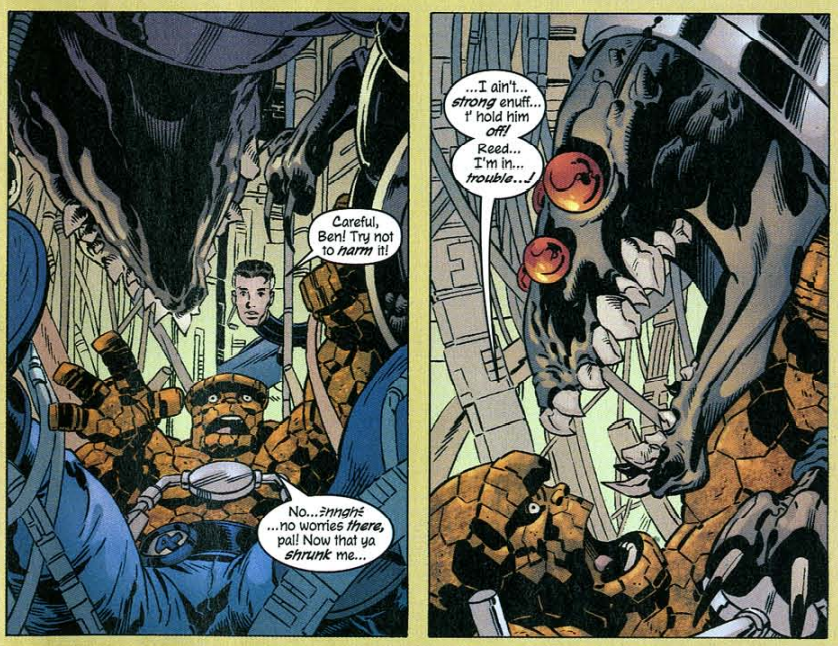 Clobberin’ time: Why does Ben lose strength when he shrinks? According to our old friend The Official Handbook of the Marvel Universe: Deluxe Edition, when you shrink, your excess mass is temporarily shunted into a non-Einsteinian parallel universe where it is temporarily stored safely until you return to normal size. Makes perfect sense.