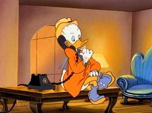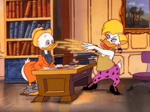 Glad to be here: Gladstone Gander was a main character in the duck comics that inspired DuckTales, but his appearances in the show are few. His comics history emphasizes his unnatural good luck, but he was also something of a rival for Donald, often succeeding where Donald failed and even putting the moves on Daisy Duck. I’m unclear on how he is related to Scrooge. Some sources say he’s a distant cousin, but others say that Scrooge is Gladstone great uncle-in-law. He refers to Scrooge as “Uncle” throughout this episode.