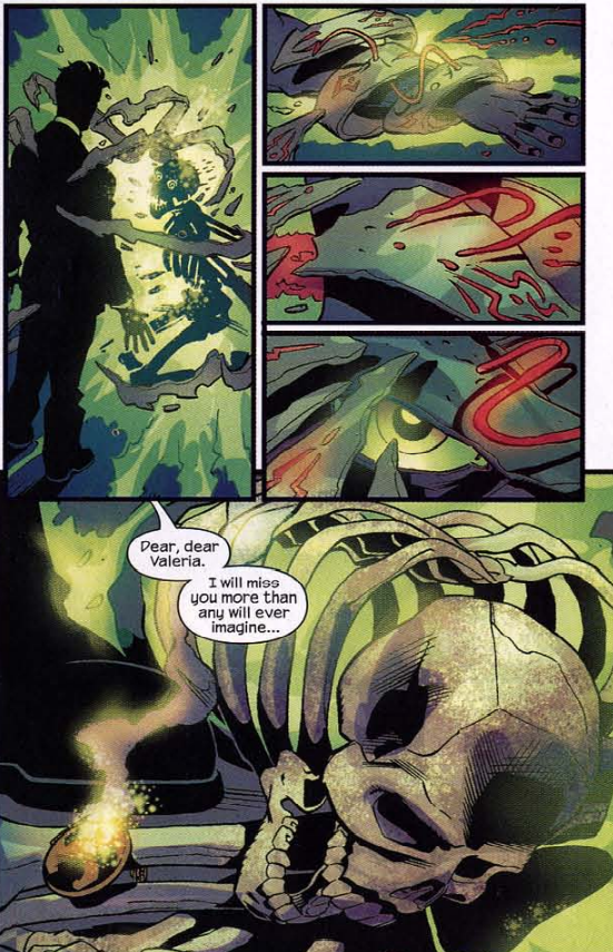 Then things get really weird. Valeria’s flesh separates from her body, leaving only a skeleton behind. Valeria’s skin wraps around Doom, forming a new set of armor, complete with some of the glowing runes. “I will miss you more than any will ever imagine,” Doom says, “but I will always hold you close to me.”