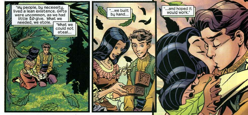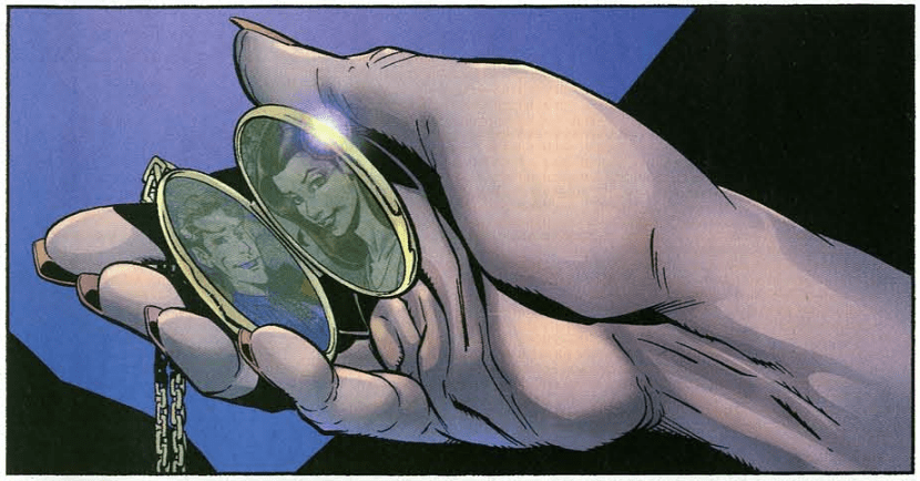 The flashback ends, and this fortune-teller reveals she’s no phony, but a genuine sorceress. She tells him Valeria’s house is just down the street, and she knows Doom is in town searching for her. Doom confronts Valeria, giving her a locket with photos (paintings?) of the two of them inside. He asks her to come back to Latveria with him. He says he has removed his famous armor to no longer be the man he once was. With Valeria, he can be a new man.