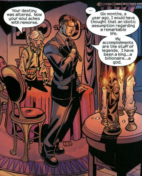 At the next fortune-teller, Doom reflects on his youthful romance with Valeria. She was there to comfort him when his mother died, and the two of them found his father’s secret stash of magical books and items. They both studied Doom’s father’s work. Doom combines magic and science, while Valeria becomes an accomplished Sorceress. They fought to protect their families from outsiders, until an American man came and offered Doom the change for an education in NYC. The flashback ends, and Doom gives the fortune-teller crap for “cheapening” the art of divination.