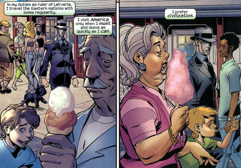 We then see that Doom is in a tourist-y boardwalk in Cassamonte, Georgia, where there are a bunch of psychics around. Doom scoffs at them all for imitators of true magic-users. He also takes a moment to scoff at America in general, going on about how uncivilized it all is. He’s here because this where Valeria’s trail has gone cold.