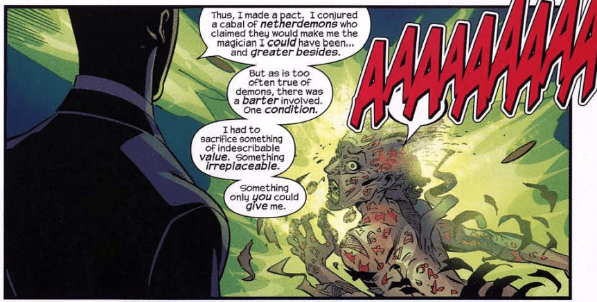 The locket then flows with green light, and creepy runes appear all over Valeria’s skin. Doom says that when he was young, he chose science over sorcery, but now she’s going back on that choice. He further explains that he’s recently been in contact with a group of netherdemons who promised to make him a great magician, but only if he sacrificed something of great value – something only Valeria could give him.
