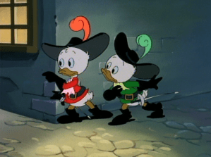 Donning musketeer outfits, Huey and Louie help Scrooge, Launchpad, and Iron Mask escape from the tower. They rescue Dewey, and the whole group confronts the fake Count Roy and his guards. After much slapstick swordfighting, our heroes win the day. Count Roy yields, and Iron Mask retakes the kingdom as the Count of Montedumas. He provides Scrooge with a generous financial reward in hopes that Scrooge will invest it wisely. Huey and Louie praise Dewey for his ingenious escape plan, telling him, “You’re one of a kind.”