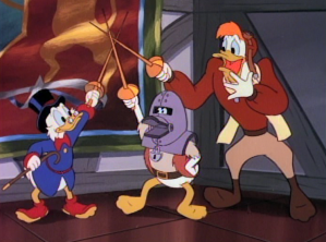 Thoughts upon this viewing: It’s not often that that the show gives the three nephews distinct personalities, let alone an episode that emphasizes this. That alone makes this one a standout. All the Three Musketeers stuff is also a lot of fun. I would have liked the final swordfight to be more action-y and less jokey, but that’s DuckTales for you.