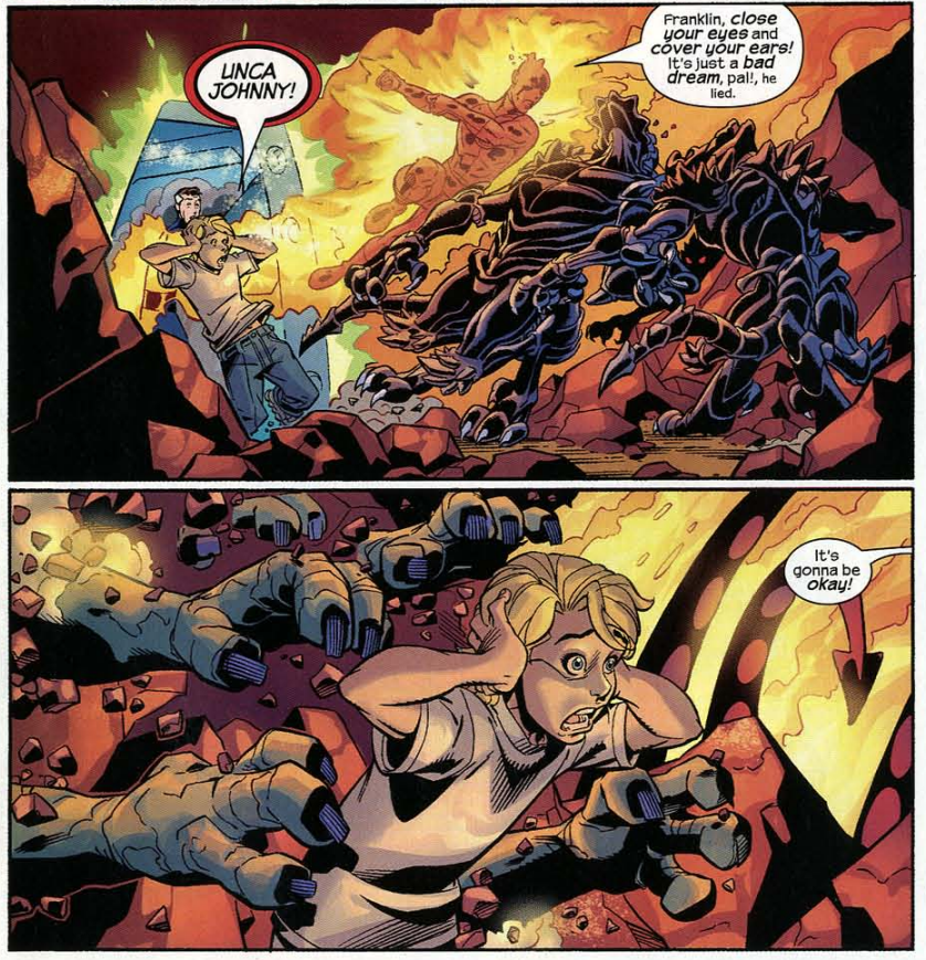 Reed prepares a Fantasticar for the journey not into the hell-world, but to Latveria. Reed patches up Johnny’s burned leg. Sue says she’s bringing the baby along on the trip, because nowhere is safe at the moment. Elsewhere (the caption just states, “Hell”) Franklin wakes up in a dark chamber, only to be snatched up by the Haazareth Three. He cries out for his mom. Back in the Fantasticar, Reed has packed weapons on board, saying he’s not messing around. Ben contacts Dr. Strange, warning him about Doom’s newfound magical power. Strange has tiny demons crawling all over him, suggesting that Doom has already gotten to him. Ben then gets on Reed’s case about issues regarding magic. Ben says Reed doesn’t like magic, because that’s the only time Reed isn’t the smartest guy in the room.