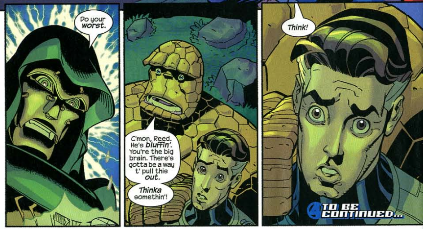 In Latveria, the Fantasticar cannot land, because Doom has surrounded the country with a “no-science zone.” The Fantasticar crashes, and Doom is waiting for the FF as they emerge from the wreckage. Everyone fights, but Doom has a spell ready to counteract each of the FF’s powers. After defeating the FF, Doom tells them to “Do your worst.” Ben pleads for Reed to think of something, but the final panel shows a look fear in Reed’s face, suggesting that the big brain is out of ideas.