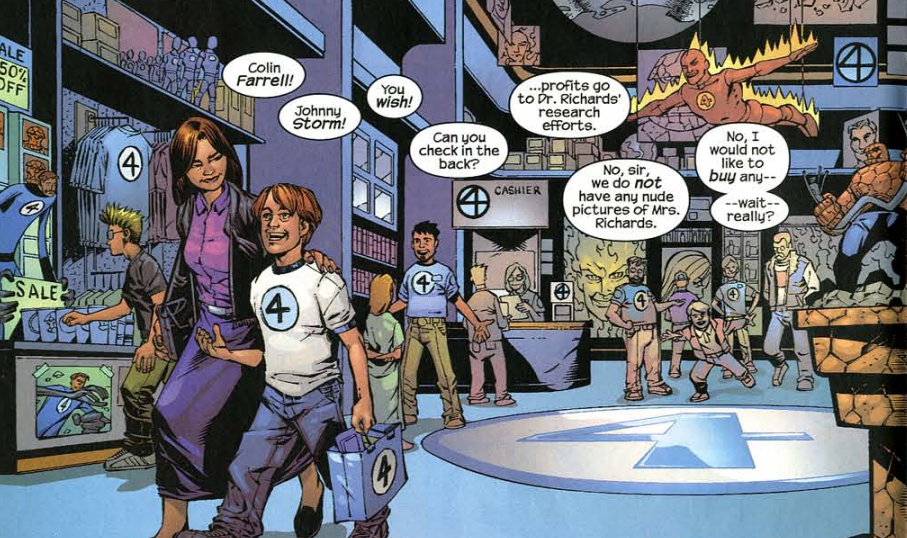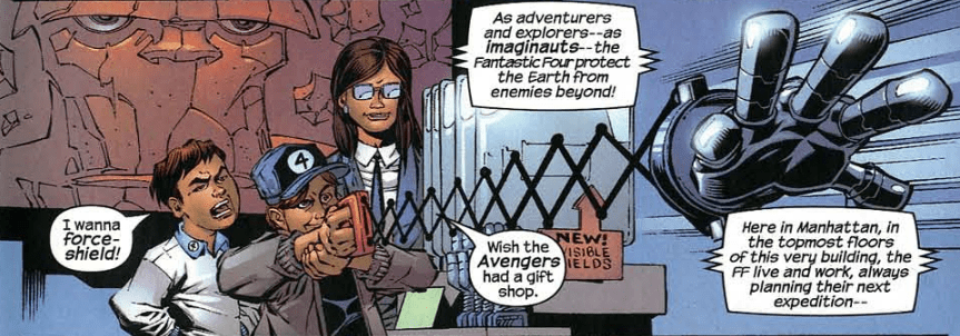 We begin in the gift shop inside the new Baxter Building, where Fantastic Four fans are buying t-shirts and playing around with souvenirs. Some fans say it’s been a long time since the FF were sited in person, and they wonder if the heroes are even at home. Turn the page, and we see the wreckage from the recent fight against Dr. Doom has not yet been repaired.