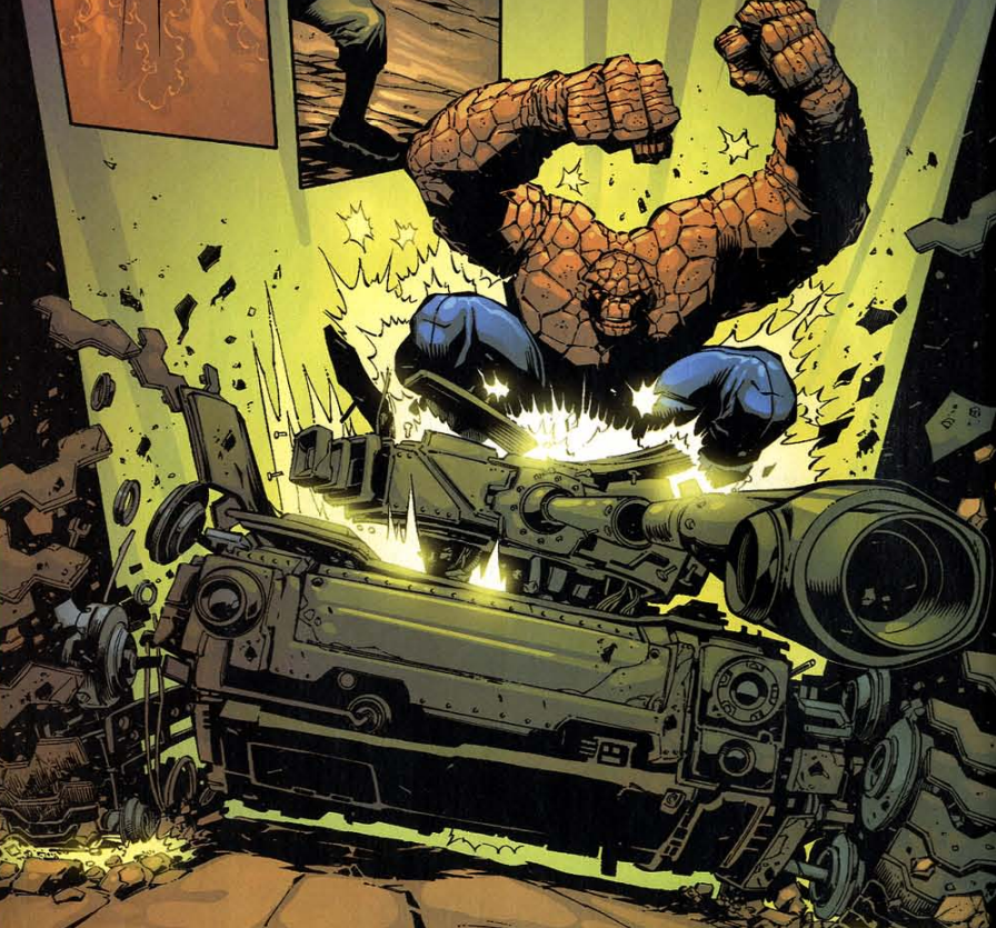 Reed tells the Hungarians that if they consider invading Latveria again, he’ll hit the country with a computer virus. The army retreats. Reed says that while the U.N. debates what to about Latveria, he’s not going to let anyone help themselves to Dr. Doom’s technology while it unguarded. But then the locals protest, and the Latverian army turns on the FF. Ben says their real goal is not so much protecting the border, but getting inside Castle Doom.
