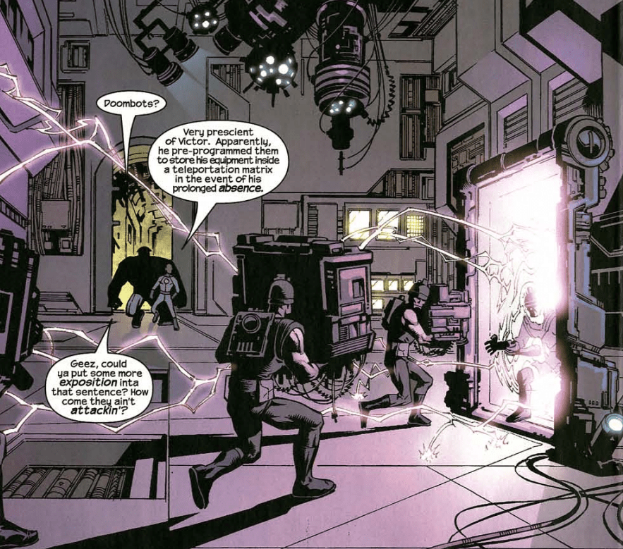 Reed gives the FF special armbands containing Doom’s DNA, which will help get past the castle’s automated security. Remember last issue, when Reed swiped some of Doom’s hair from the past. That hair is this DNA. They enter the castle, with Reed telling the staff, “There’s a new sheriff in town.” They make their way into Doom’s lab, where Doombots are storing all of Doom’s tech inside a “teleportation matrix,” to protect it all in case of Doom’s absence. They fight the Doombots and recover most of the tech.