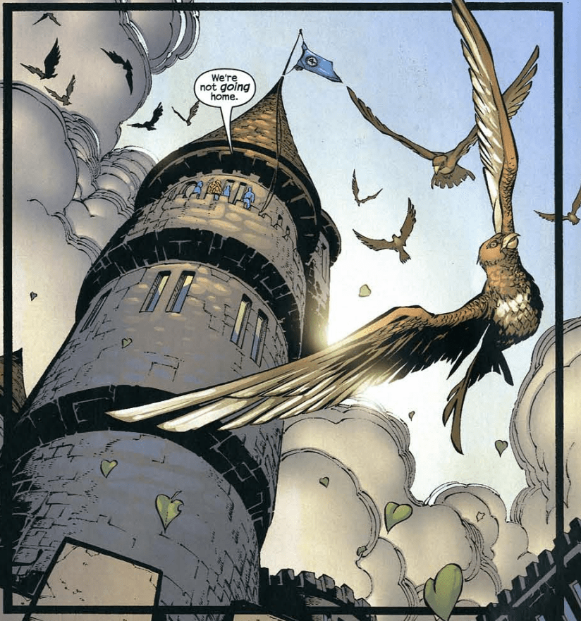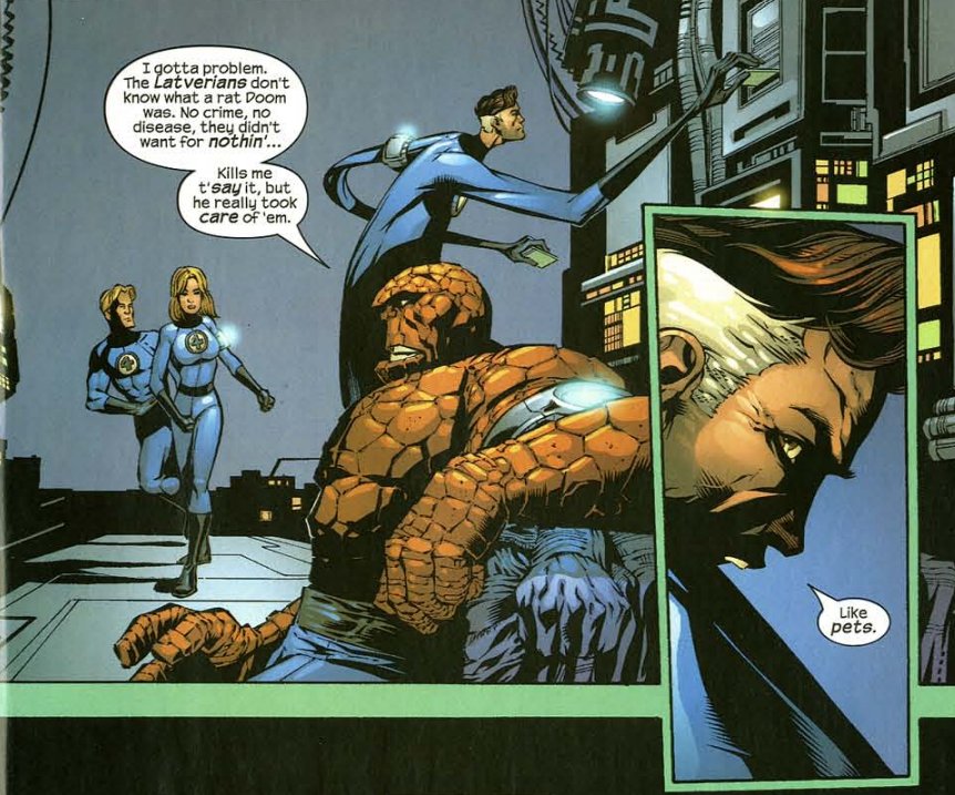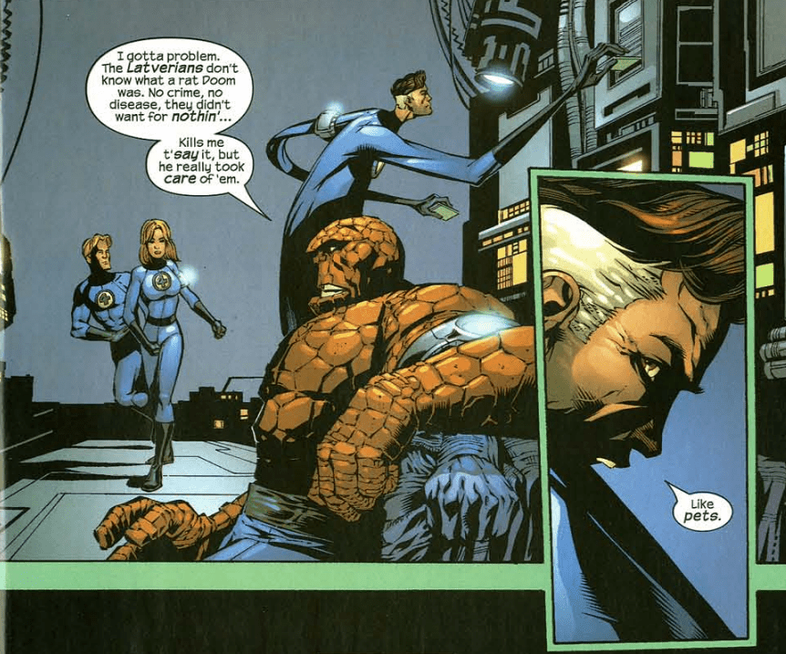 The Latverian people gather outside the castle to protest the FF’s presence. Ben says that if the Latverians knew the real Dr. Doom, they’d be grateful. Reed shows up and says that Latverians are loyal to Doom because Doom gave them everything – food, shelter, healthcare, etc. Everything, that is, except freedom. Reed then removes his shirt, converts into a flag, and flies it over the castle. “We’re not going home,” he says.